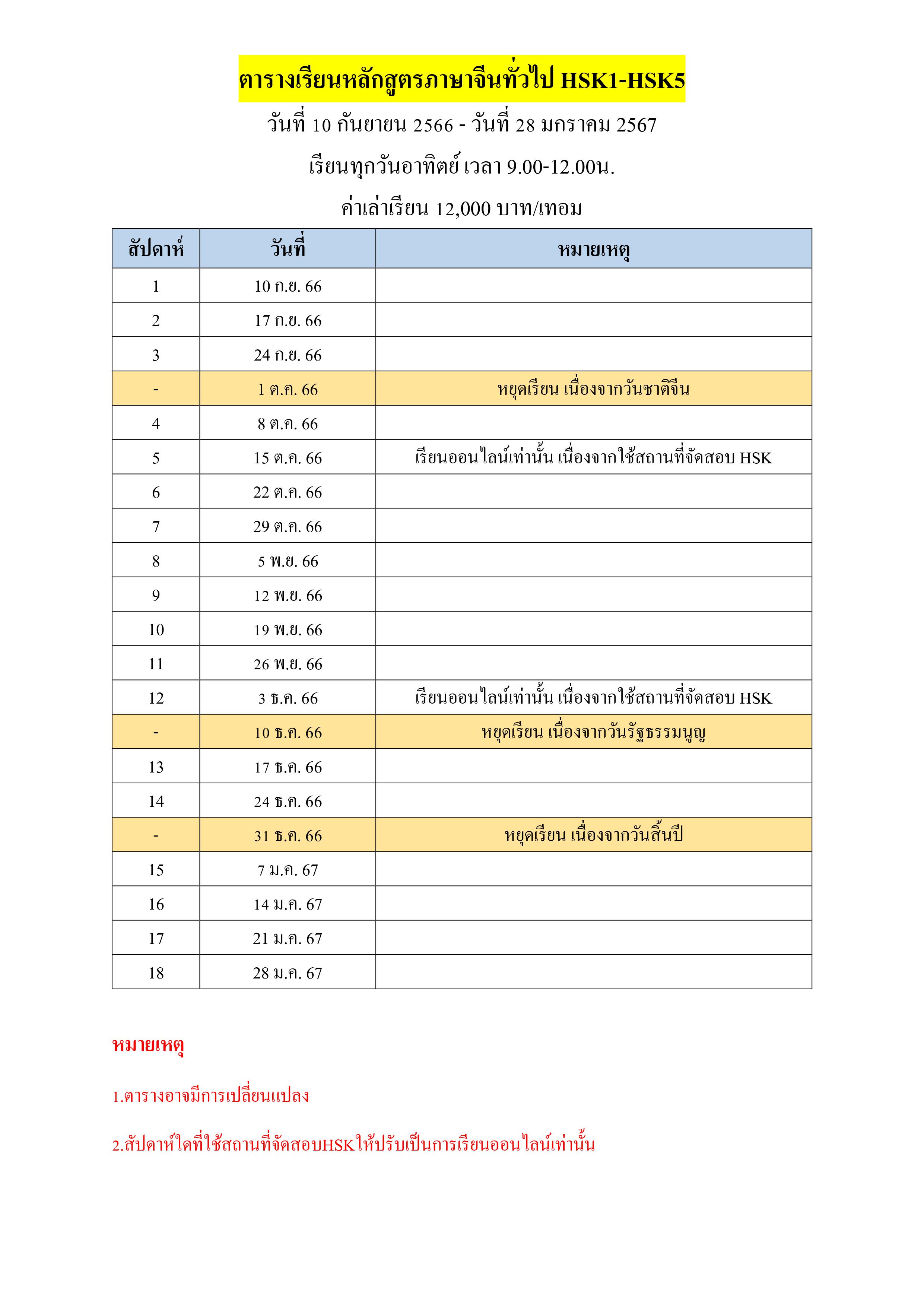 ตารางเรียนหลักสูตรภาษาจีนทั่วไป (HSK1-6)